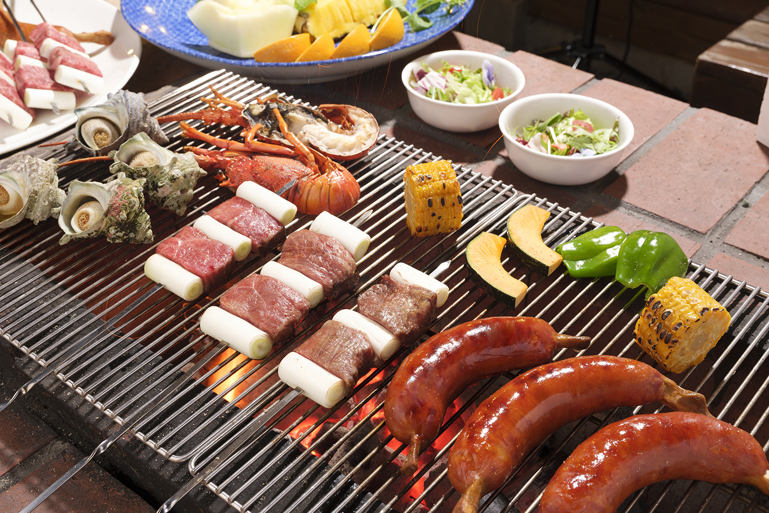 新鮮な肉や魚介類などの山の幸・海の幸を味わうバーベキュー(5月〜9月)。