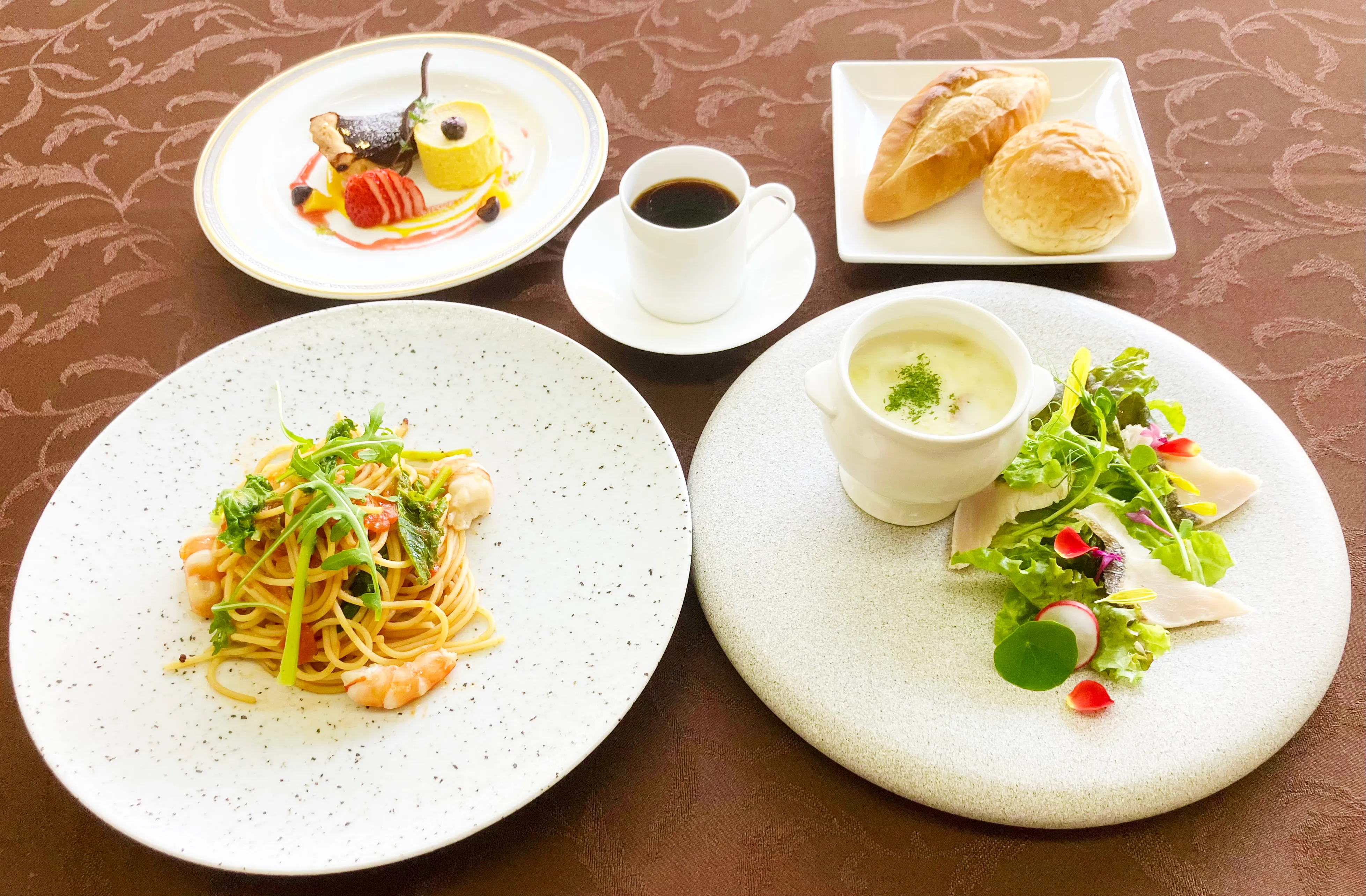 Lunch Course 3,300円(税抜3,000円) 魚介のマリネサラダ仕立て ~青山リゾート産の食用花をあしらって~ シェフ特製スープ 三重県産本日のお魚と天使海老 シェフおすすめのデザート コーヒー 自家製パン |