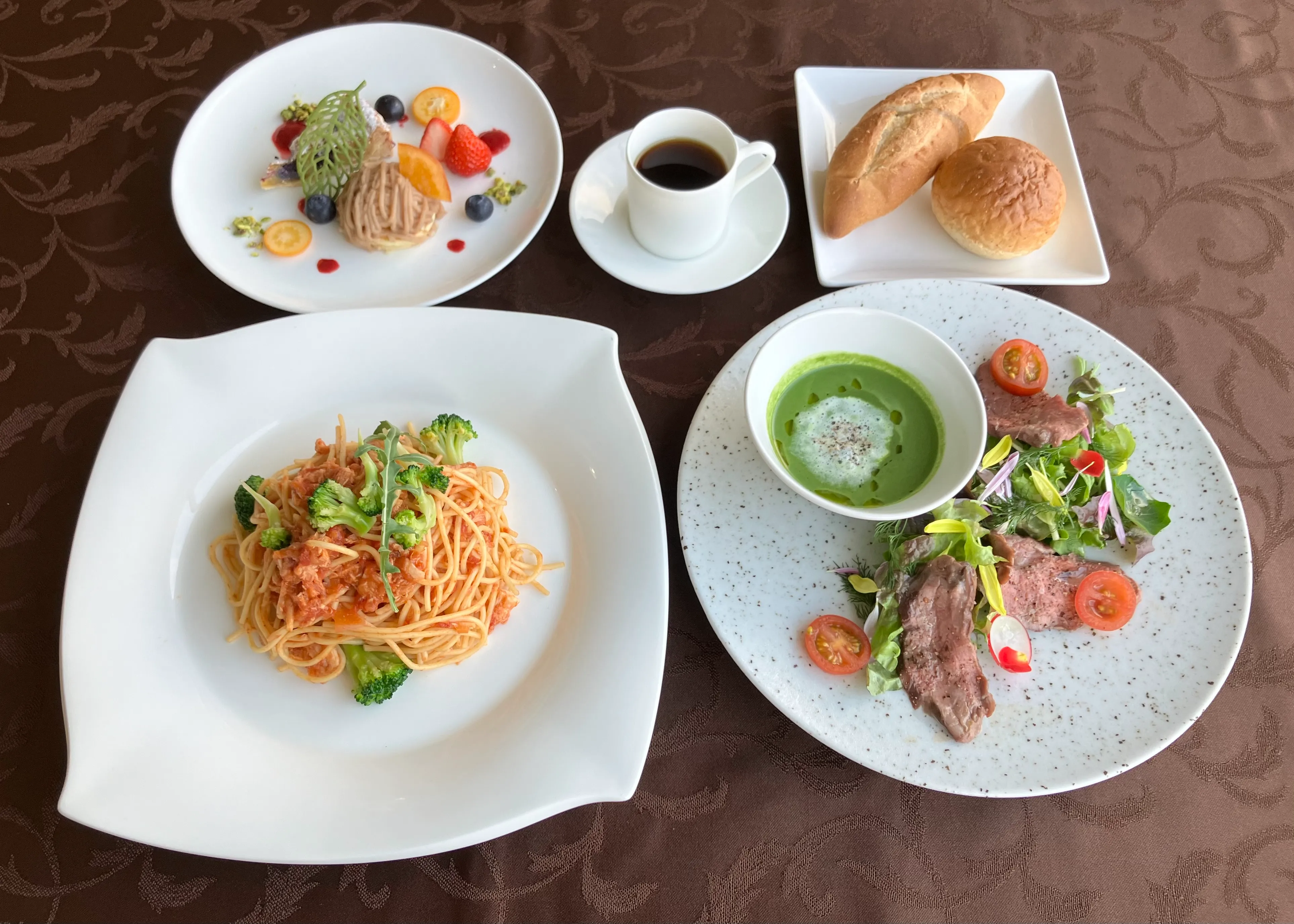 ほうれん草のスープ ローストビーフとサラダ <選べるメイン料理> ・鶏のささみとブロッコリーのパスタ(写真) または ・サワラのフリット カレー風味 または ・伊勢鶏もも肉のコンフィ 自家製パン 本日のデザート コーヒー |