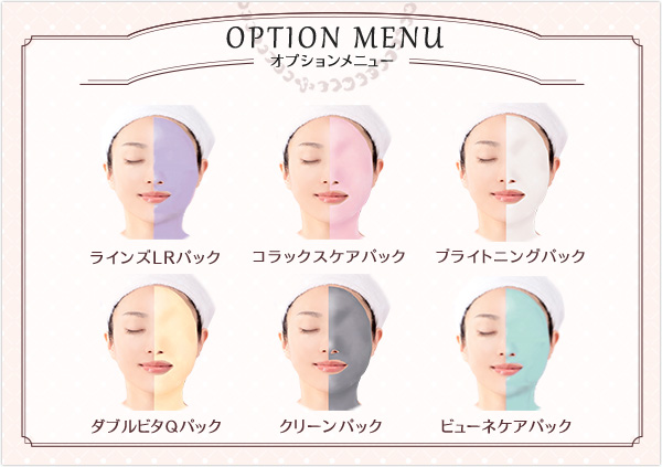 気になる部分は、アドバンスコースにオプションメニューをプラス。なりたい肌に合わせたエッセンスを使った6色パックやデコルテまでケアするパックなど、全部で13種類。